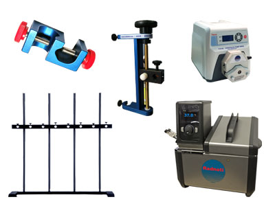 Our thermal circulation pumps and peristaltic pumps. Also all of our lab stand hardware and universal stand clamps and system tubing.